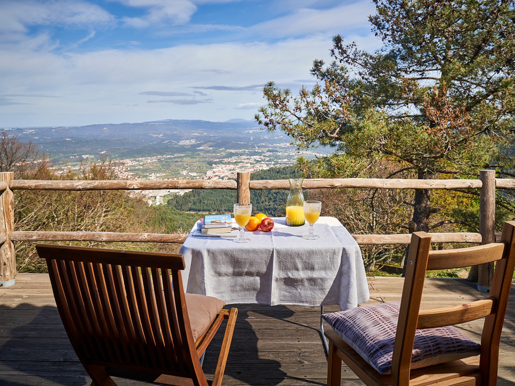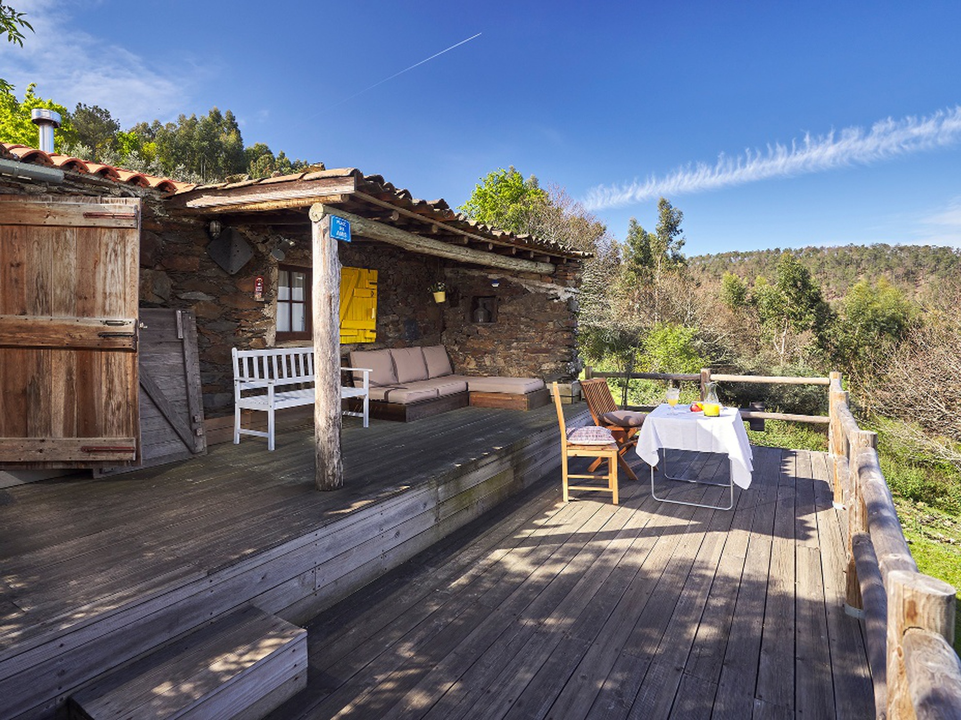 É também no segundo piso que se localiza um amplo terraço. Aqui, encontra 2 sofás, uma mesa para refeições com cadeiras, uma cama de rede, almofadas de chão e uma espreguiçadeira. Tudo para que possa relaxar e desfrutar dos sons e das paisagens que a natureza envolvente proporciona.