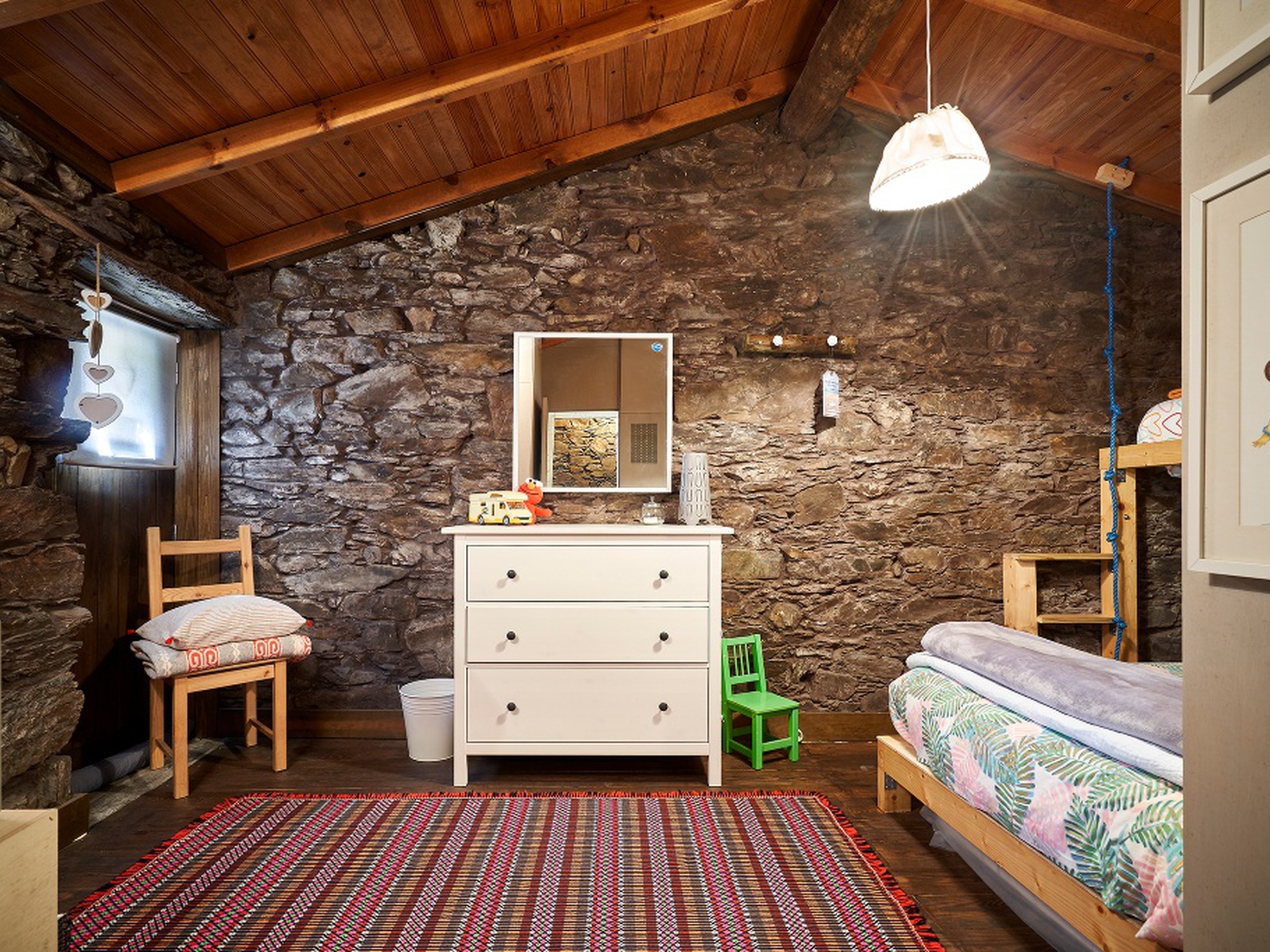 No piso superior, há 2 quartos, ambos climatizados. O quarto 1 tem cama de casal, cómoda e, se necessário, cama de viagem para bebé. O quarto 2 está equipado com beliche, cómoda e uma estante com uma pequena aparelhagem.